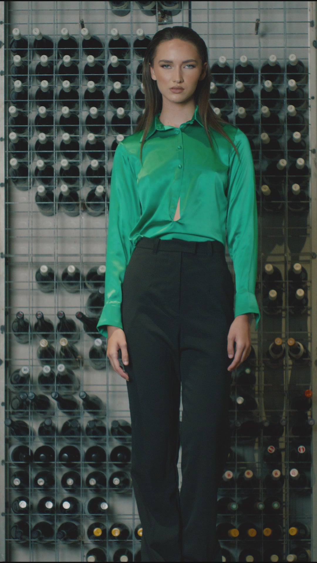 High-rise tailored pant crafted in Virgin wool blend suiting. Side vents elongate the leg. Finished with side seam and back welt pockets. Cut narrow to sculpt the body.